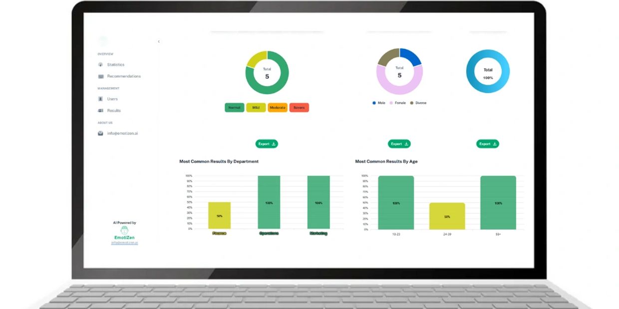 - Businesses and organizations can anonymously monitor employees' anxiety levels and moods through EmotiZen intelligent dashboards. After employees answer short medical questionnaires via the EmotiZen App, companies receive accurate insights and evidence-based recommendations for their employees, all while protecting their privacy and respecting their anonymity. Consequently, based on EmotiZen's true-to-life insights and suggestions, firms can enhance their working environments and create a more sound and pleasant atmosphere, thereby reducing employee absenteeism.
